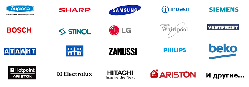 Atlant, Beko, Bosch, Candy, Daewoo, Electrolux, Gorenje, Haier, Hisense, Hotpoint-Ariston, Indesit, Korting, Kuppersberg, LG, Liebherr, Midea, Nord, Panasonic, Samsung, Sharp, Siemens, Smeg, Stinol, Toshiba, Vestel, Whirlpool, Zanussi, Бирюса, Полюс, Саратов, Минск, Ardo, AEG, Neff, Grundig, Kaiser, Franke, Hansa, Amica, Hoover, Blomberg, Brandt, Fagor, Hitachi, TCL.